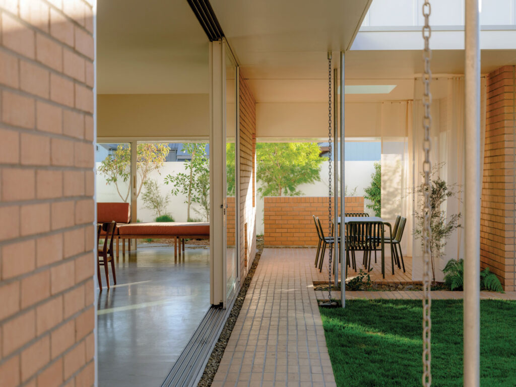 Window openings connect internal living spaces to a shaded planting corridor, creating a sense of refuge from busy professional lives.