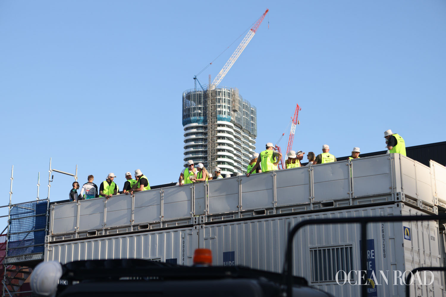 As the afternoon unfolded, the atmosphere became electric. Airtime FMX delivered an impressive display of motorbike stunts, launching high above the slab with precision and flair, their performances echoing across the island. The Henchman team served burgers and drinks from their elevated position atop the containers, creating a vibrant festival-style feel that kept the crowd fuelled and engaged. The event brought together the Bastion team, Built team and project partners, all sharing in the excitement and camaraderie.