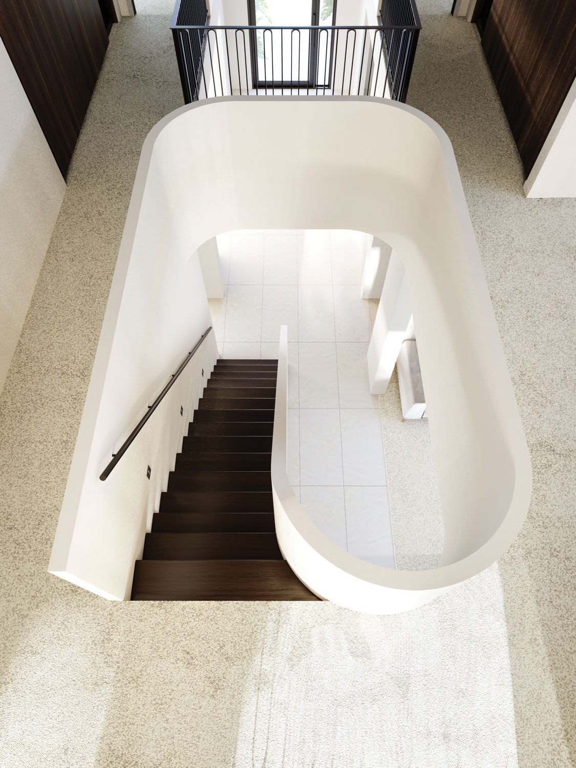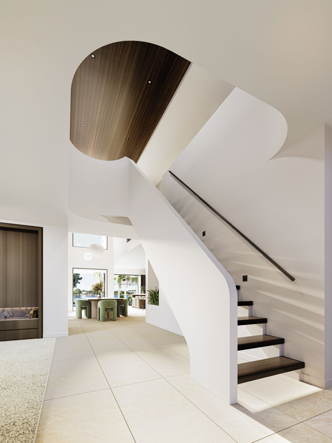 At the heart of the home, a sculptural staircase connects the levels with ease, echoing arched windows and rounded walkways to create visual continuity. Living, dining, and kitchen areas flow seamlessly into outdoor entertaining spaces, embracing the Australian love of indoor-outdoor living.